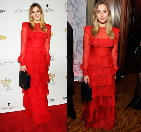 Elizabeth Olsen se jogou nos babados e no vermelho Valentino para o Grand Chefs Dinner, em Nova York. A atriz arrematou o longo, da coleção de outono/inverno 2012 da grife, com uma bolsa preta da The Row, grife de suas irmãs, maquiagem bem discreta e cabelos soltos. O resultado ficou feminino e super romântico. Recentemente, Elizabeth Olsen contou que você “literalmente tem que ter um stylist” na hora de se vestir para eventos glamurosos como os que frequenta por conta de sua carreira: “Eu não fazia ideia do que vestir e nem gostava de usar vestidos pra começo de conversa”, disse a Olsen, completando que hoje em dia ficou divertido se montar. Quem assina seus looks é Cher Coulter, stylist da Kate Bosworth e da Sienna Miller.
